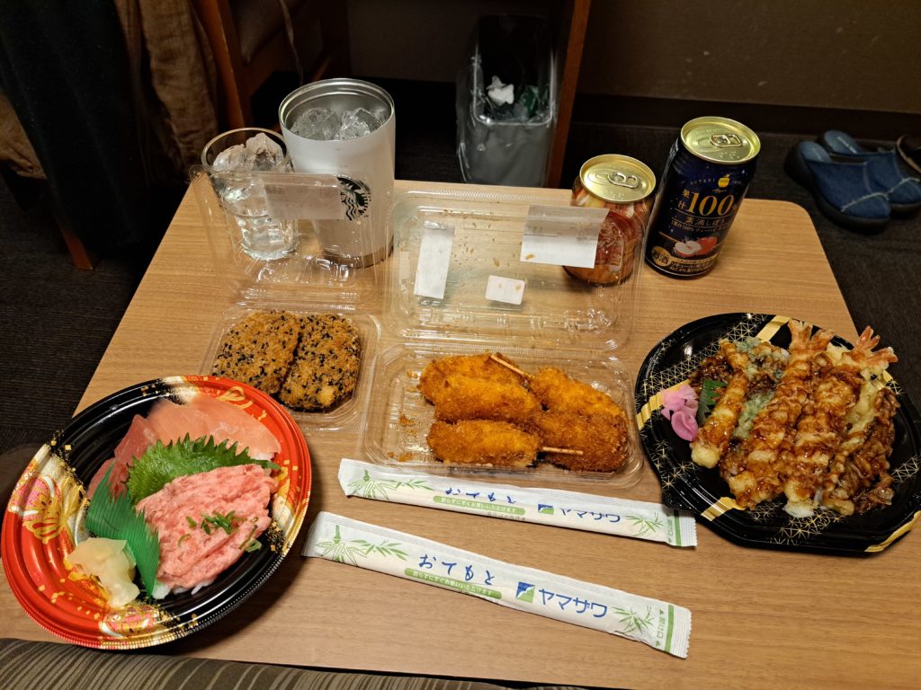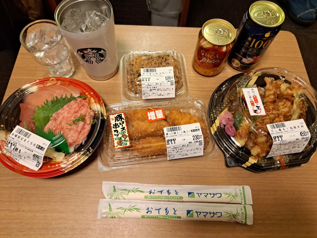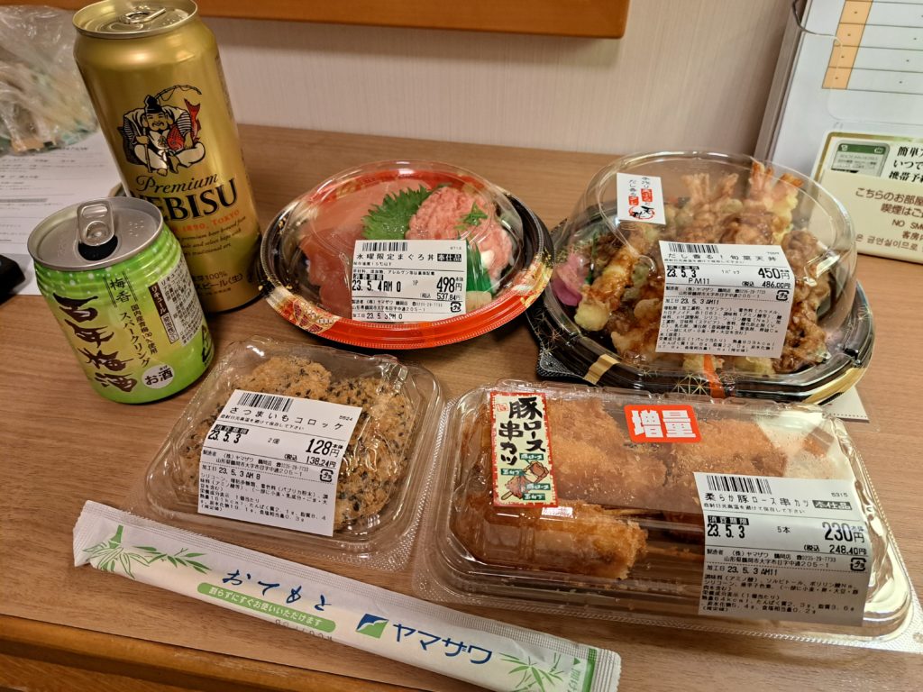 そして夕食はスーパーで買ったお弁当やら