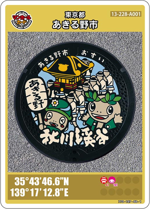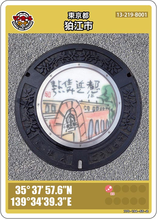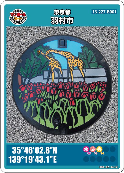 羽村市![]() 35°46’02.8″N 139°19’43.1″E | 羽村市動物公園 チケット売り場 【3~10月】9:00~16:00 【11~2月】9:00~15:30 毎週月曜日(月曜日が祝日の場合は営業) 年始(1/1)はお休みです 徒歩で3分 実際のマンホールを撮るには入園料がかかります | |