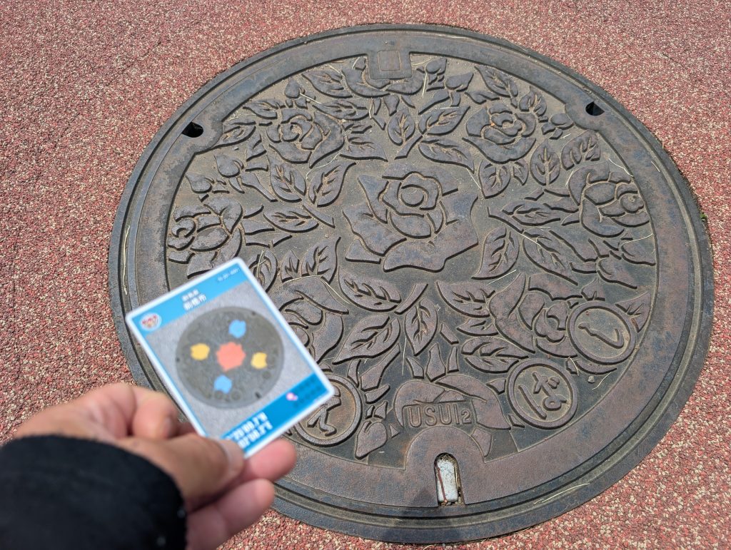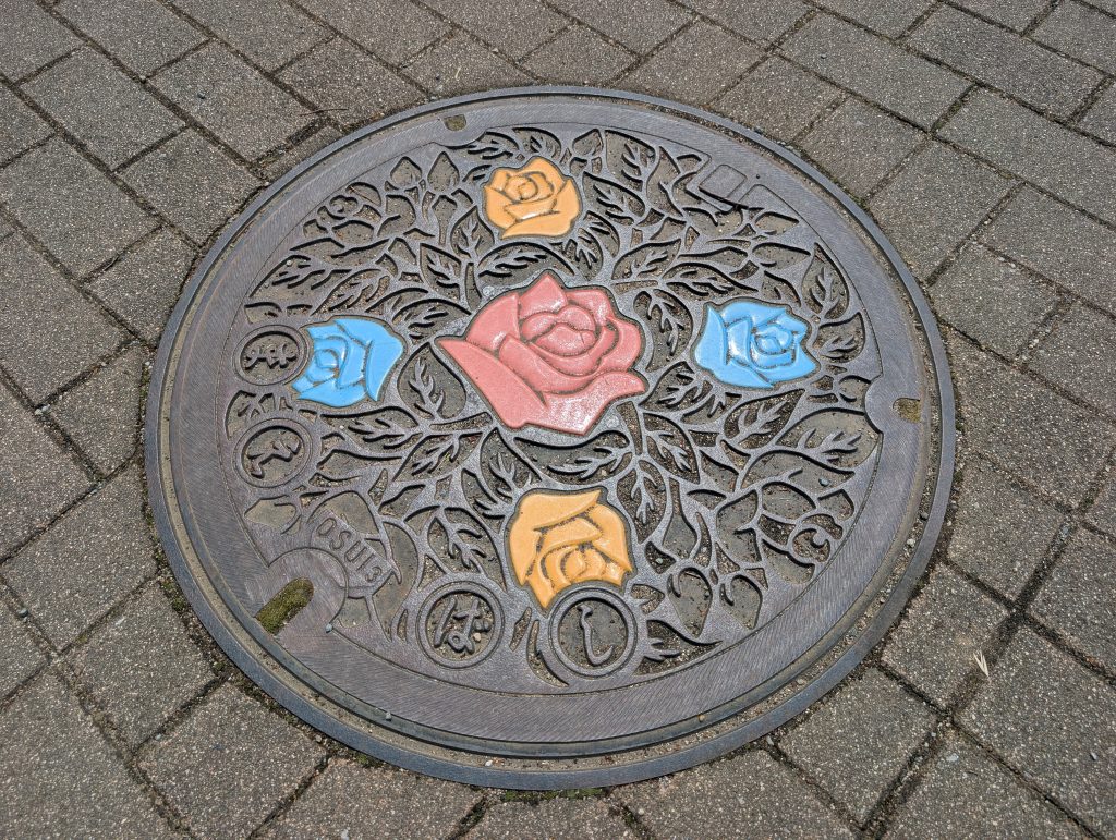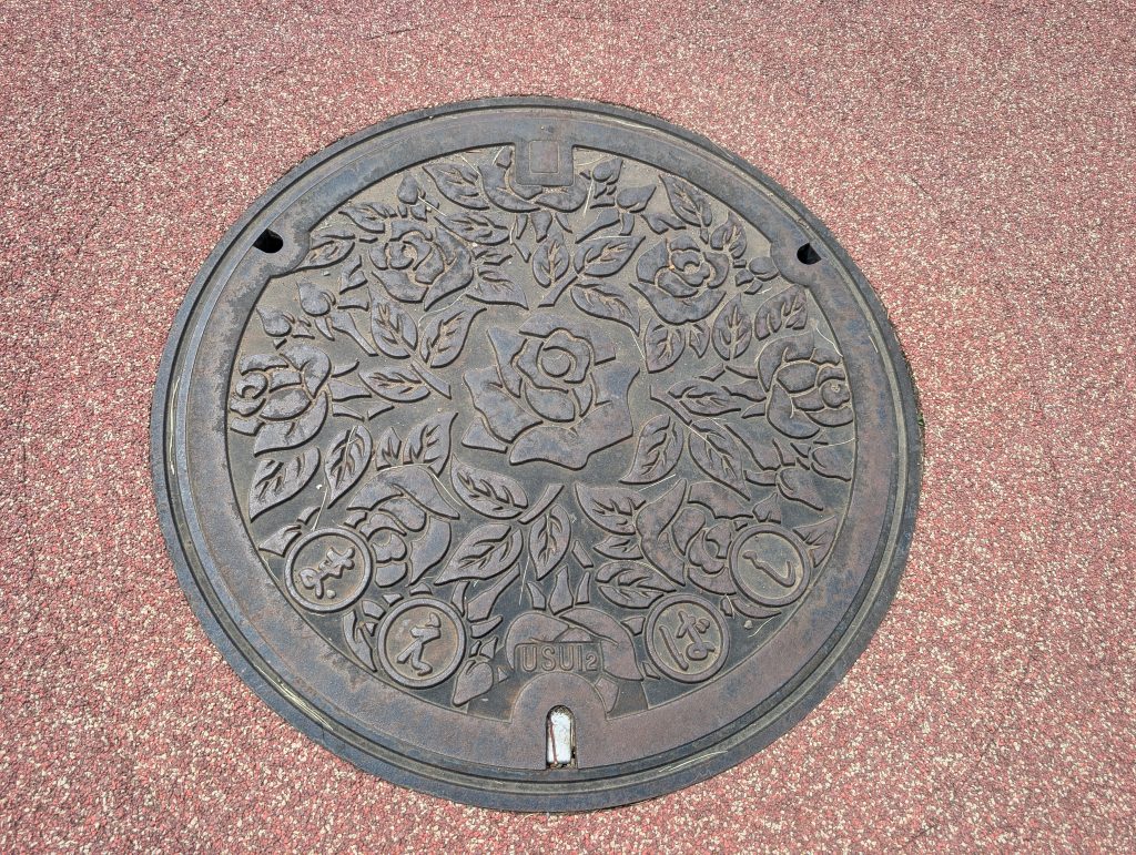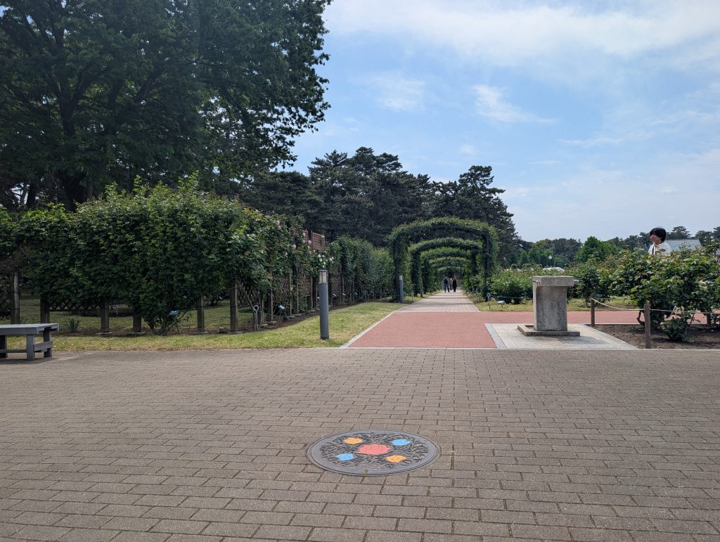 バラ園内にはモノクロデザインマンホールも設置されているので
